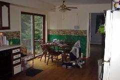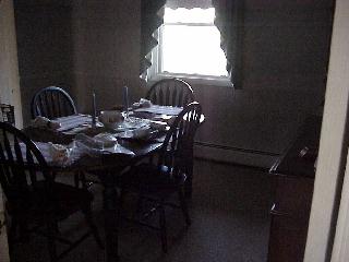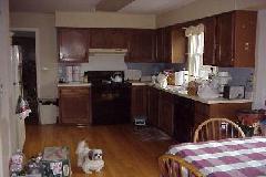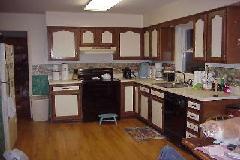 At the end of the front hall is the eat-in kitchen. You see the before and after versions. Before is on the left and after is on the right. The wallpaper was nearly impossible to get off, but we did it. The colors of the wall are dark green (bottom) and ivory (top). The border in the middle is made up of a bunch of fruits and vegetables. Very kitchen-like. Melissa painted the cabinets - they make the kitchen much brighter and more cheery.