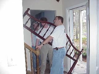 Roy & Tom (Moeller) are enjoying something happening upstairs while they wait to bring our king-sized headboard to the second floor. Andy is supervising, of course.