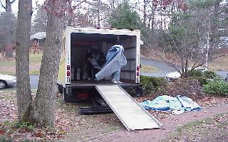 This was our Ryder truck - well, the back of it, at least. That's Andy throwing one of the furniture pads off the truck while others work on getting the mattresses out.